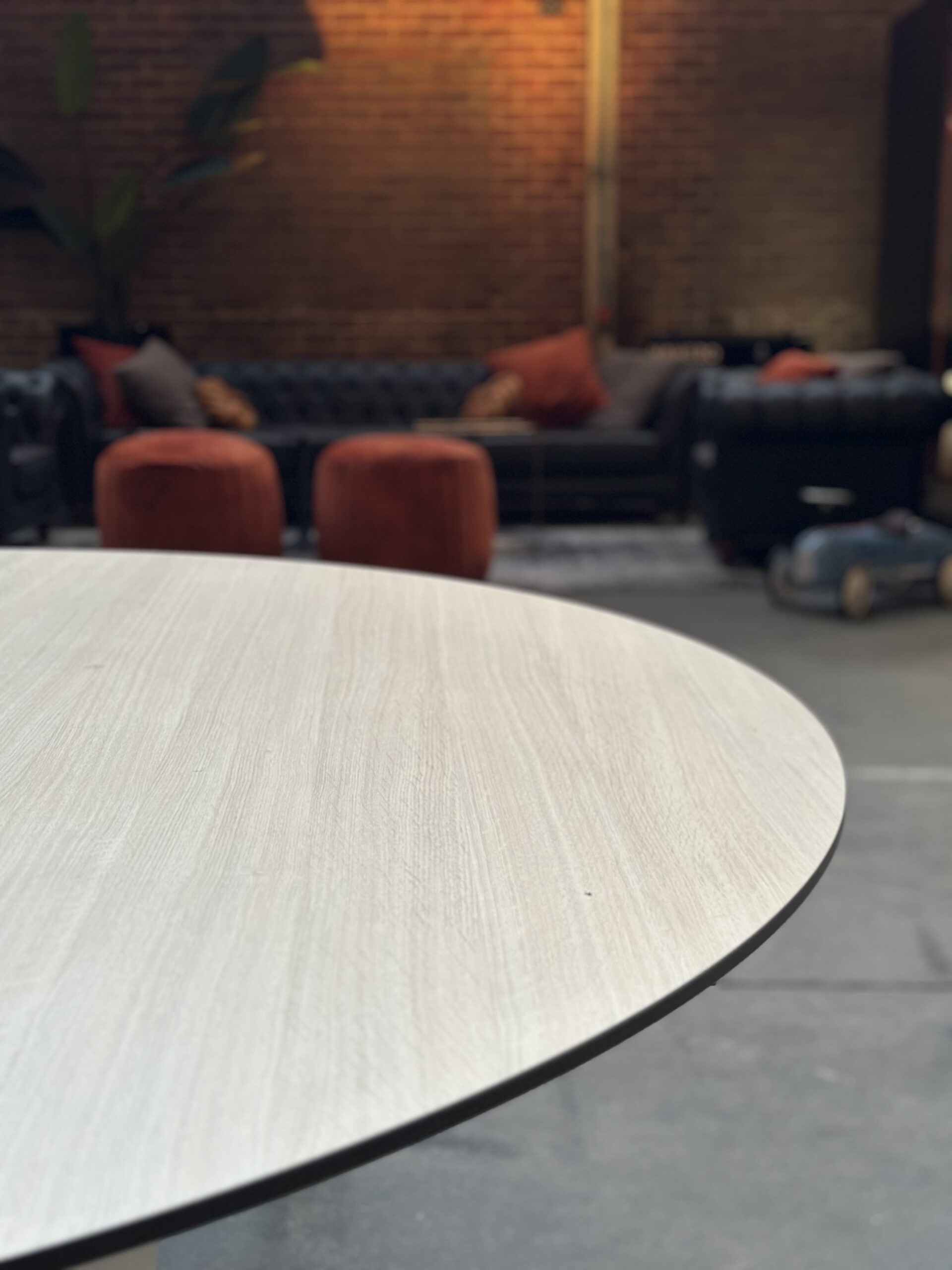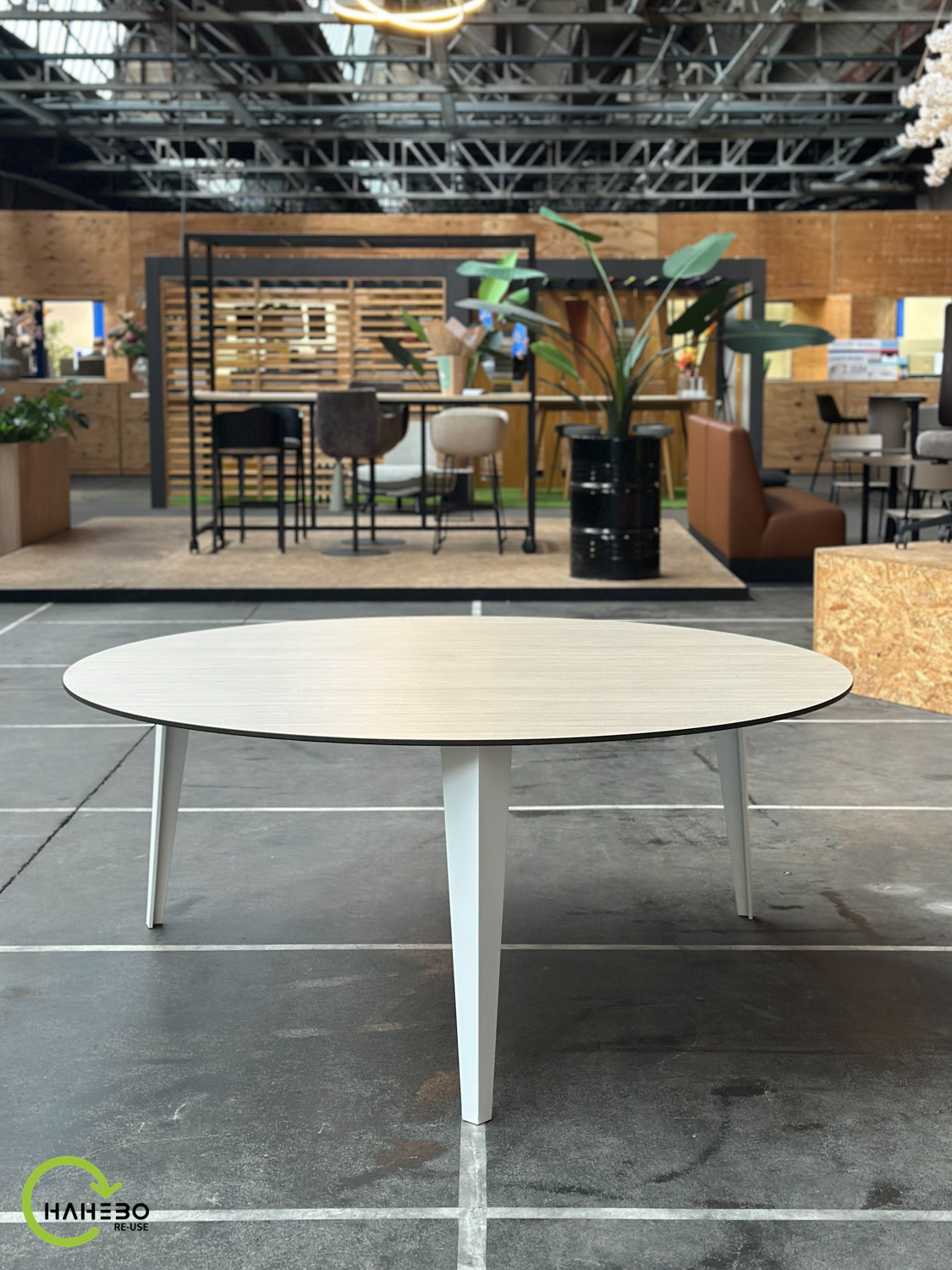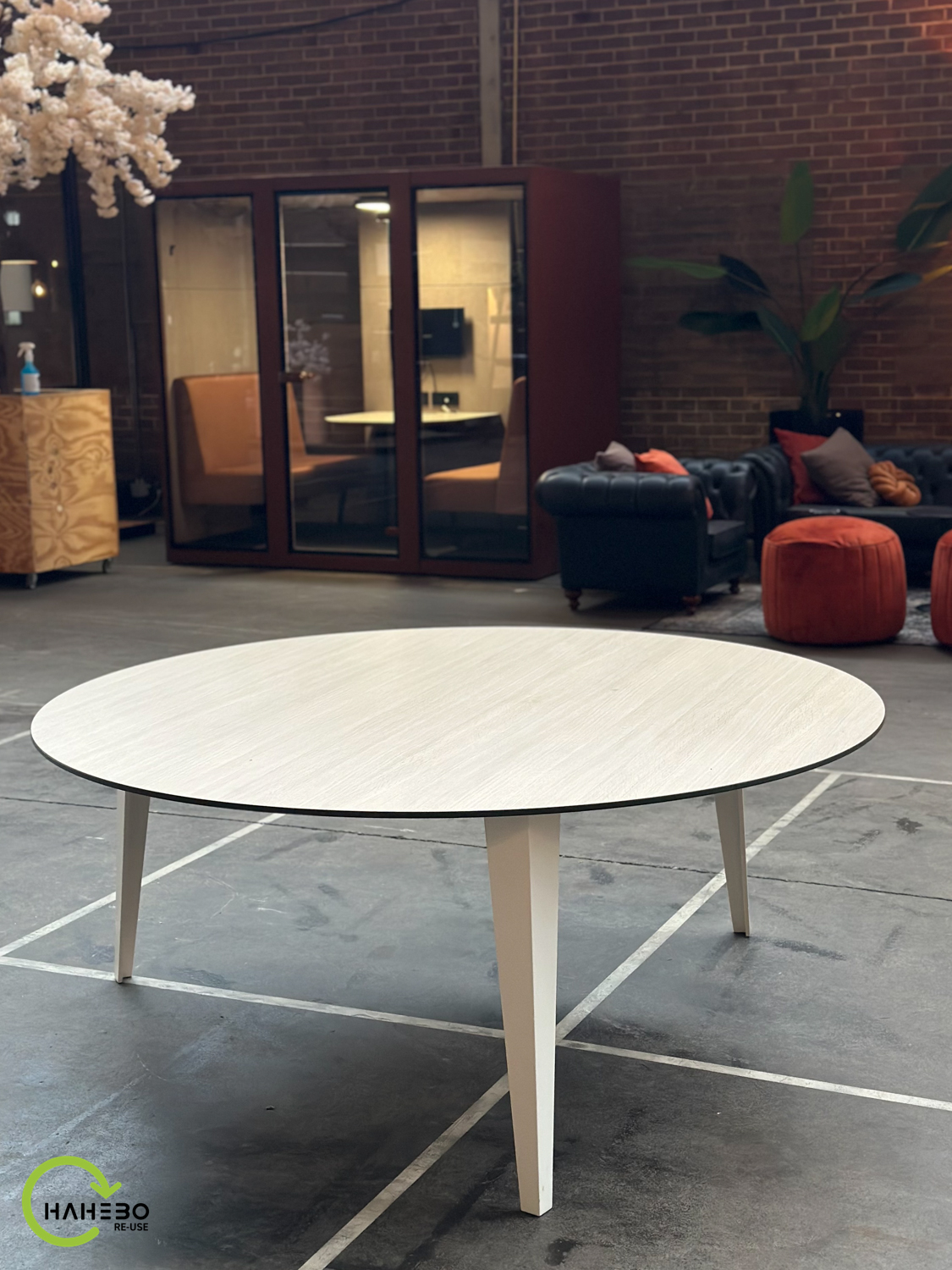 Deze ronde vergadertafel van Ahrend is een degelijke en prettige tafel voor overleg, meetings of gezamenlijke momenten. Het eikenhouten blad geeft de tafel een warme uitstraling, terwijl het witte frame zorgt voor een frisse en rustige basis.