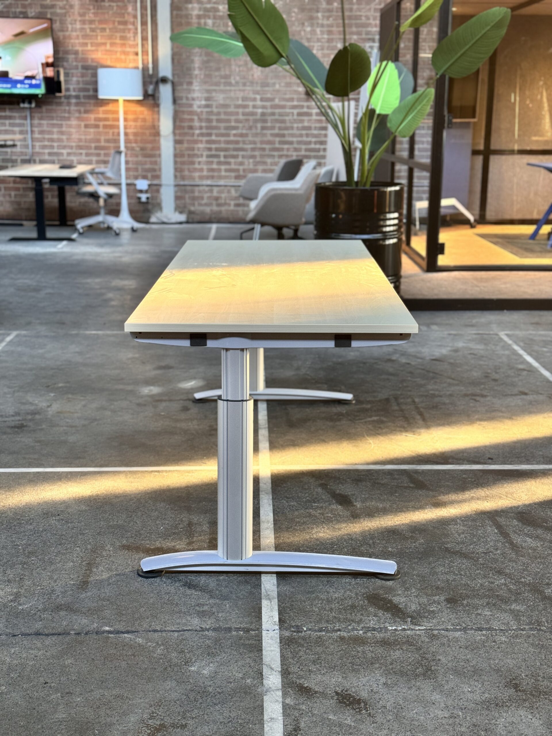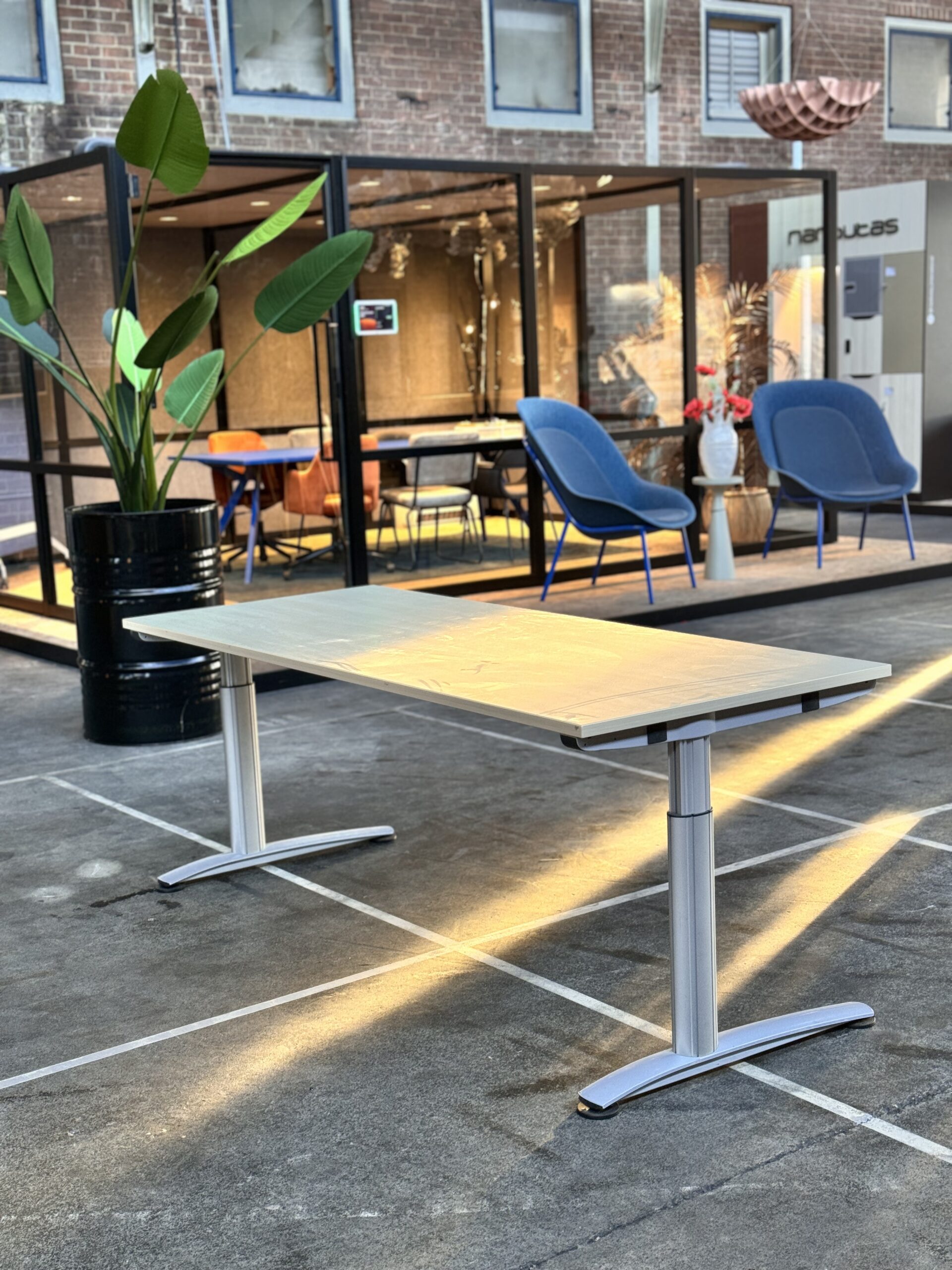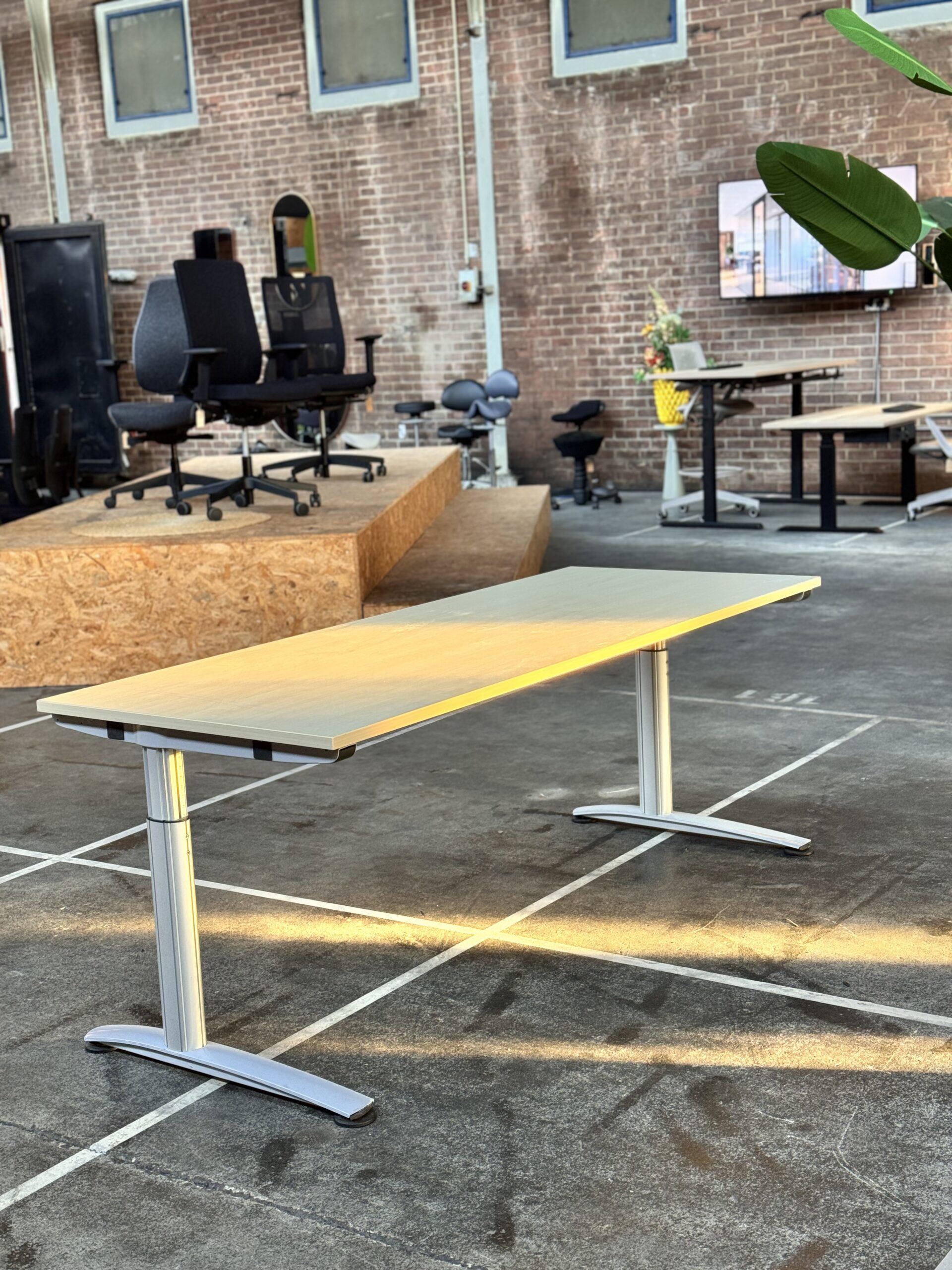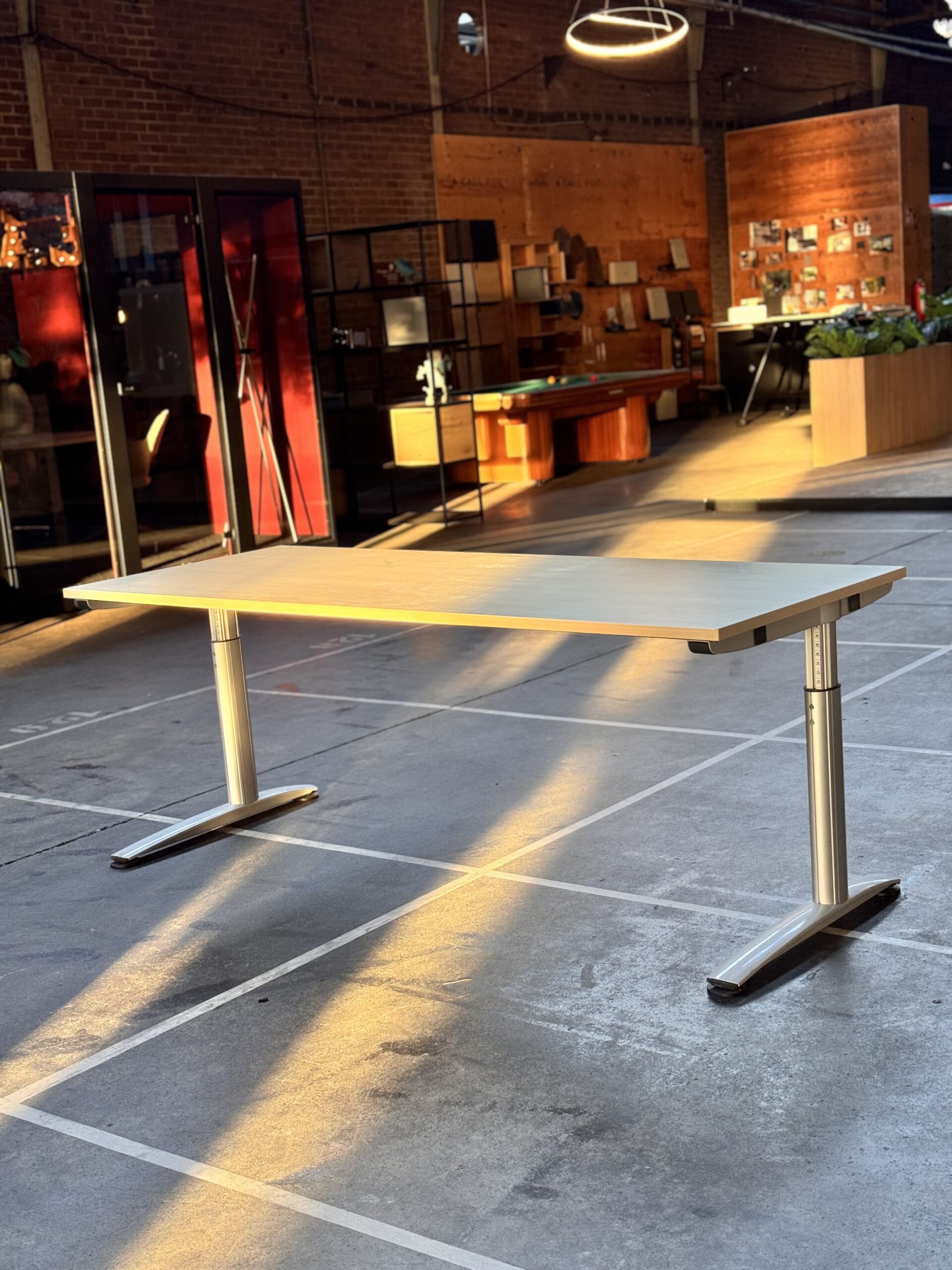 Dit verstelbare bureau met eiken blad biedt flexibiliteit en comfort voor iedere werkplek. Dankzij de verstelbare poten is het bureau eenvoudig aan te passen aan verschillende werkhoudingen en gebruikers. Het warme eiken blad geeft het bureau een rustige, professionele uitstraling en past goed in zowel kantoor- als thuiswerkomgevingen. Verkrijgbaar in meerdere maten, waardoor er altijd een passende oplossing is voor de beschikbare ruimte. Het bureau verkeert in goede staat en is direct inzetbaar.